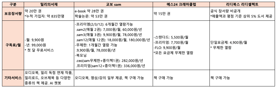 그래서 국내의 전자책 구독 서비스를 제공하는 밀리의 서재, 교보문고 샘, 리디북스 리디셀렉트, 예스24 크레마클럽 등을 조사해 봤다.