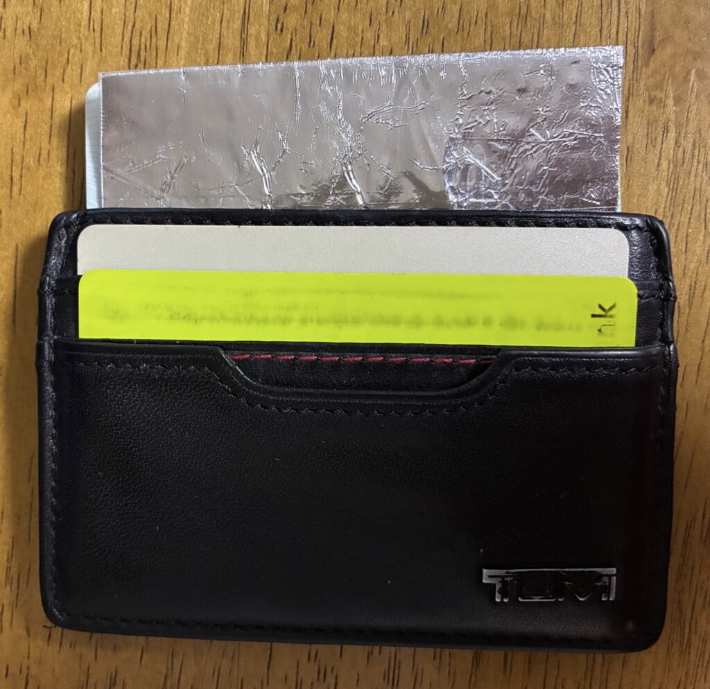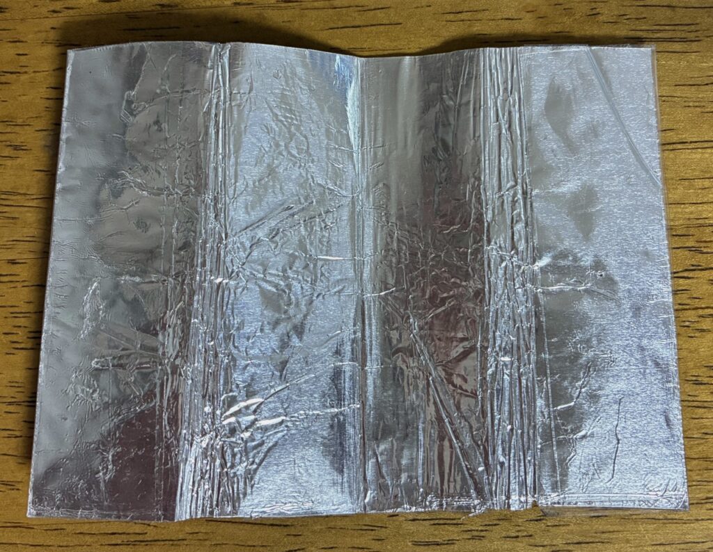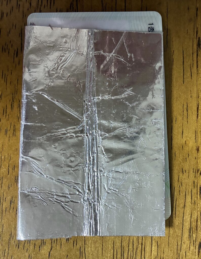 전자공학지식을 활용하기로 하고, RF신호는 은박지에 차폐된다는 전자공학시간에 배운 게 기억나서, 주방에 있는 은박지를 카드크기로 잘라 두겹으로 접고, 두겹 사이를 스카치 테이프로 접착하여 주었다.